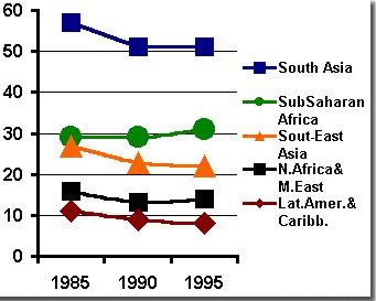 Global progress in reducing the prevalence of underweight since 1990, or even progress in most regions, is still less than one fifth of that necessary to reach the goal of halving the prevalence from 1990-2000; this goal was approved at the World Summit for Children and reaffirmed at the International Conference on Nutrition. |