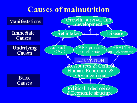 Poor diet and disease actually result from underlying causes related to insufficient access to food by families or households, inadequate caring practices provided to vulnerable members of the household, generally mothers and young children, and inadequate access to health services and to a healthy environment (e.g. clean water). It is necessary to identifiy in a specific situation what are the major constraints to providing adequate access to food, to health services and to care. These can be influenced to a certain extent by education but they fundamentally result from how ressources are used in society and who controls them; this in turn results from the political and ideological superstructure that is prevalent.