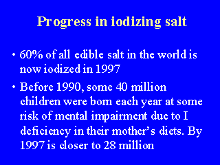 ![]() ![]() ![]() | | The progress achieved in salt iodization is remarquable but is not due to chance. It is the result of policy-makers successfully joining efforts with legislators, salt producers and distributors, as well as consumers, to effect these substantial changes. International groups e.g. the Kiwanis have also provided major support in many different forms. The attached table |