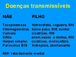 Toxoplasmose, citomegalovirus e sífilis tem a maior taxa de afecção fetal entre todas as doenças desta tabela. A toxoplasmose somente pode afetar o feto pela primo-infeção no primeiro trimestre da gestação e a taxa de mulheres susceptíveis (soronegativas) varia de 50% a 80% no mundo ocidental. A primo-infeção por citomegalovirus e por sífilis resultam em infeção fetal em 40% e quase 10% dos casos, respectivamente, mas as infeções secundárias podem também infectar o feto ainda que com uma freqüência menor.