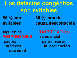 Ningún niño debe nacer con un defecto evitable. Y más de la mitad de ellos lo son. Se dispone de métodos preventivos para 70% de los tipos de defectos, que afectan a 50% de los recién nacidos defectuosos. Para la otra mitad, hay gran necesidad de dinero para la investigación a fin de develar las causas y los mecanismos del desarrollo prenatal defectuoso.
