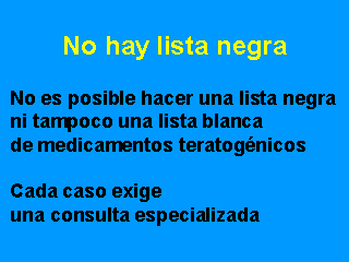 Todo, inclusive el agua potable, puede producir defectos congénitos, dependiendo de dosis, factores concurrentes y susceptibilidad genética. Por ello, no es posible elaborar una lista negra de medicamentos teratogénicos a ser evitados por mujeres en edad reproductiva. Más aún, una lista negra implicaría la existencia de una lista blanca complementaria, lo cual es un concepto erróneo. Por otra parte, nuevos medicamentos son lanzados al mercado diariamente. Por lo tanto, un servicio especializado de fácil acceso debe estar disponible para los agentes de salud y para la población en general.
