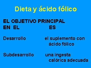 Siguiendo evidencias científicas publicada, varios gobiernos produjeron recomendaciones oficiales que, con variantes menores, incluyen el suplemento de 0,4 mg de ácido fólico diario, desde un mes antes hasta dos meses después de la concepción, es decir, PERICONCEPCIONAL. Pero, no tiene sentido proveer una sola vitamina a poblaciones pobres y malnutridas.