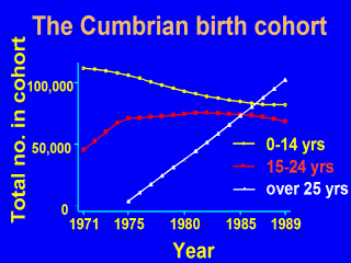 look something like this? Remember that the cohort includes all children born from 1950 onwards, so there was nobody over age 25 years until 1975. After 1975, there were more people each year over age 25. The number of children aged 0-14 years falls slowly because the birth rate fell slowly from 1971 onwards. Why does the number of people aged 15-24 years increase up to 1975 and then stay roughly constant? For more about age groups and cohorts, see Clayton D, Hills M. Statistical Methods in Epidemiology. Section 31.4, pages 311- 314. Oxford University Press. 1993. |