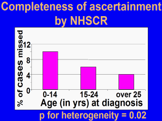 | This is what we found. Do you think NHSCR really missed more cases among children aged 0-14? We think not - we probably had better notification of these cases because we asked several children’s registries to inform us of cases. Do you think the completeness of ascertainment was better or worse for cancers diagnosed more recently? |