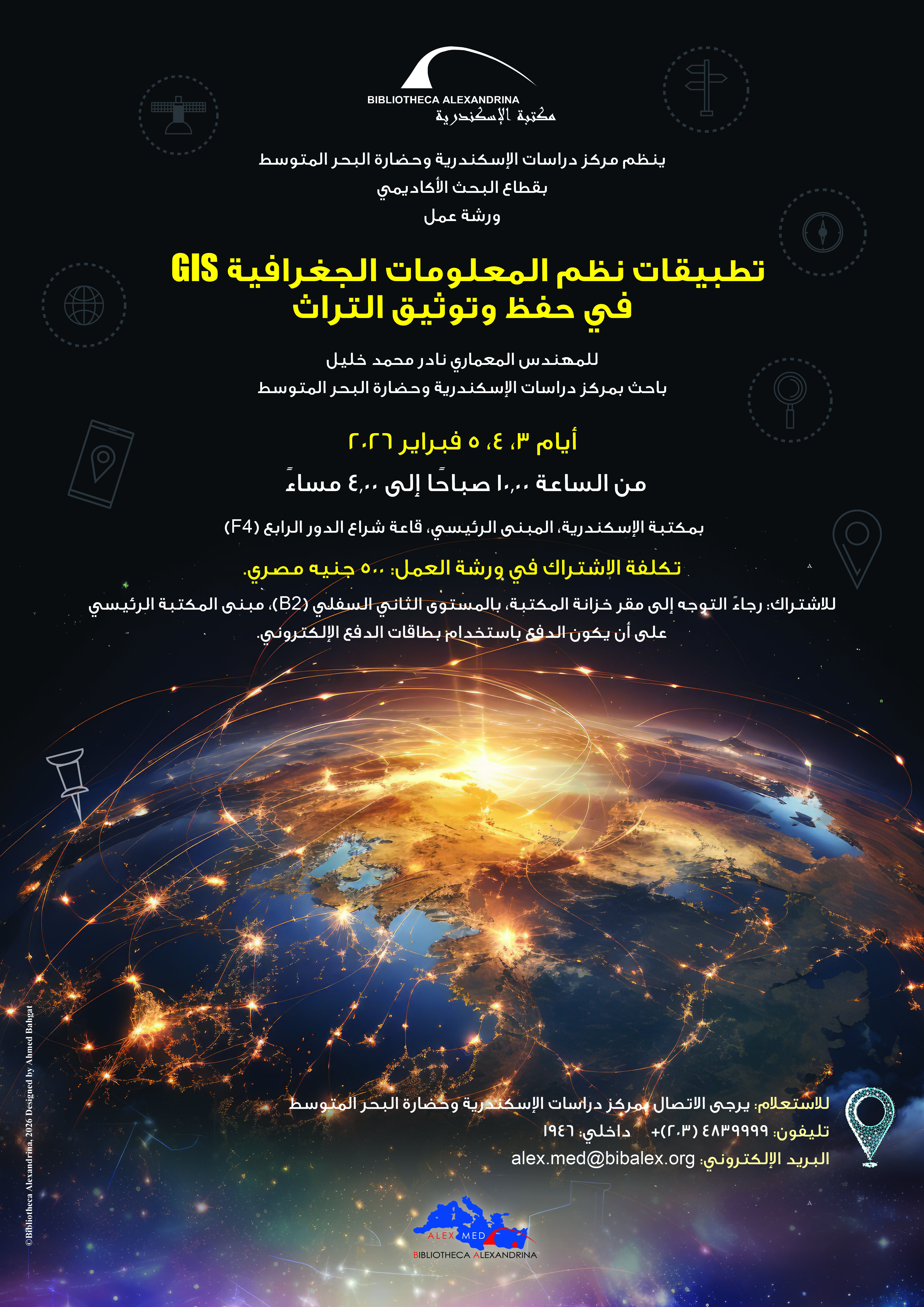 The BA Alexandria and Mediterranean Research Center (Alex Med) is organizing the third workshop on "GIS Applications in Heritage Conservation and Documentation", delivered by architect Nader Mohamed Khalil, researcher at Alex Med, on 3, 4, and 5 February 2026, from 10:00 am to 4:00 pm, in the Library’s Main Building, Fourth Floor Floating Room.