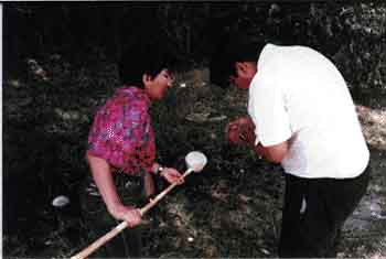 Showing Palmira Ventosilla and Pablo Villaseca with dippers, in the field.