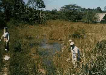 On entomological field work in Yurimaguas, Loreto, Peru. Notice a native house to the right, the ponds, and the dippers in the entomologist's hands.