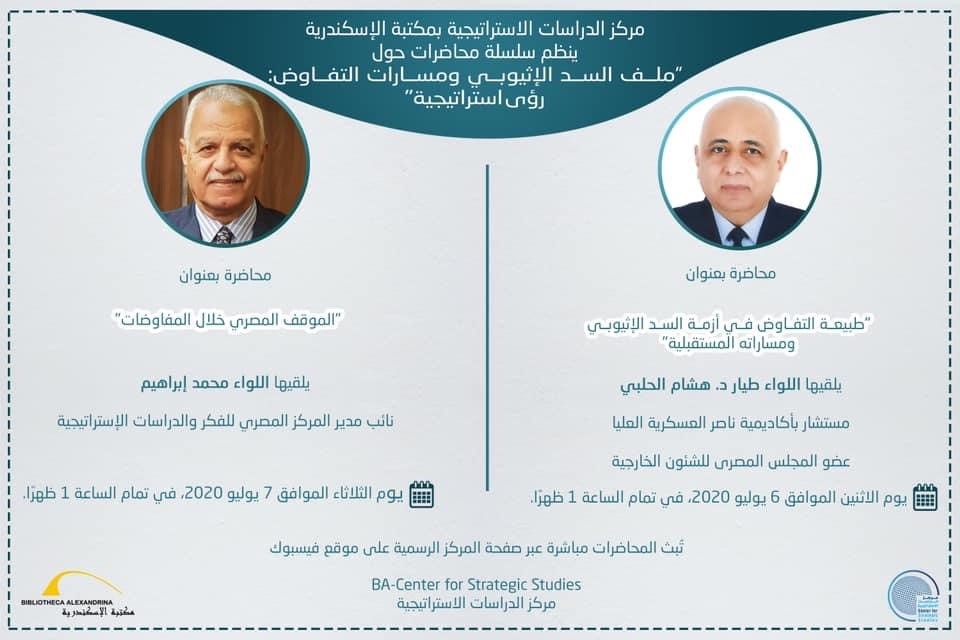 ينظم مركز الدراسات الاستراتيجية بمكتبة الإسكندرية سلسلة محاضرات حول "ملف السد الإثيوبي ومسارات التفاوض: رؤى استراتيجية". تأتي المحاضرة الأولى بعنوان "طبيعة التفاوض في أزمة السد الإثيوبي ومساراته المستقبلية" ويلقيها اللواء طيار د. هشام الحلبي، مستشار بأكاديمية ناصر العسكرية العليا، وعضو المجلس المصري للشئون الخارجية. تُعقد المحاضرة يوم الاثنين، 6 يوليو 2020، الساعة الواحدة ظهرًا.