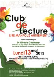 The BA Francophone Library holds, on Monday 13 May 2013, a discussion entitled “Read Mahfouz Differently” moderated by Dr. Ghada El-Gatwary, Professor of French Language and Literature, Faculty of Education, Damnhour University.