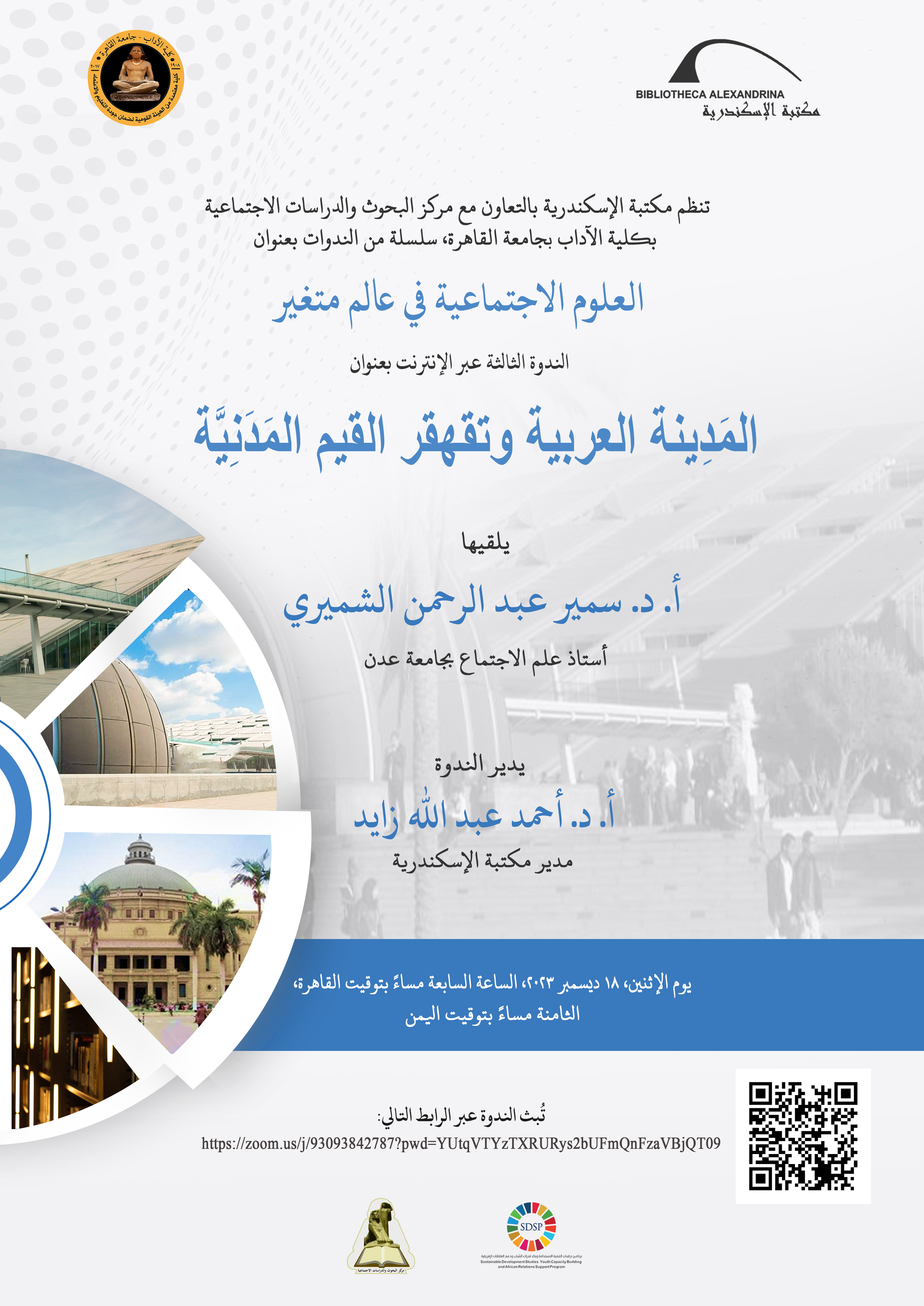 The BA Sustainable Development Studies, Youth Capacity Building, and African Relations Support Program organizes a webinar entitled “The Arab City and the Decline of Urban Values”, delivered by Prof. Samir Abdel Rahman Al-Shamiri, Professor of Sociology at the University of Aden. The event will be held on Monday, 18 December 2023, at 7:00 pm (Cairo time).
